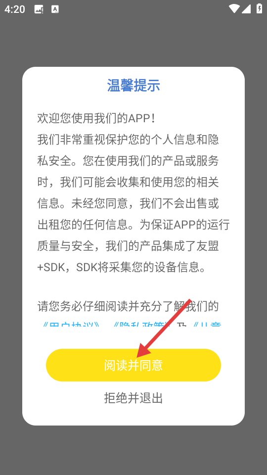 1、打开APP,在温馨提示弹窗中点击【阅读并同意】。