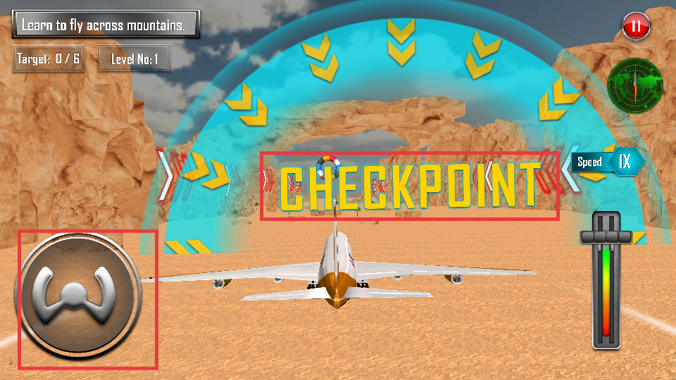 4、使用左侧操控装置调整方向,让飞机精准穿过【CHECKPOINT】,推进任务。