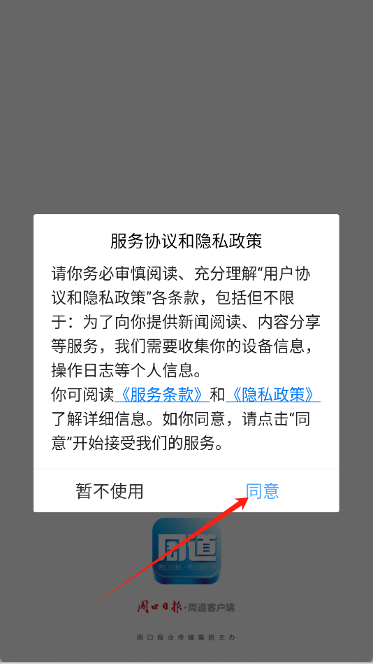 1、首次打开软件时,在服务协议与隐私政策弹窗中点击“同意”按钮。