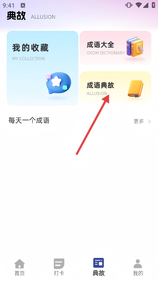 1、打开成语学习类APP首页,点击底部【典故】,进入典故页面。