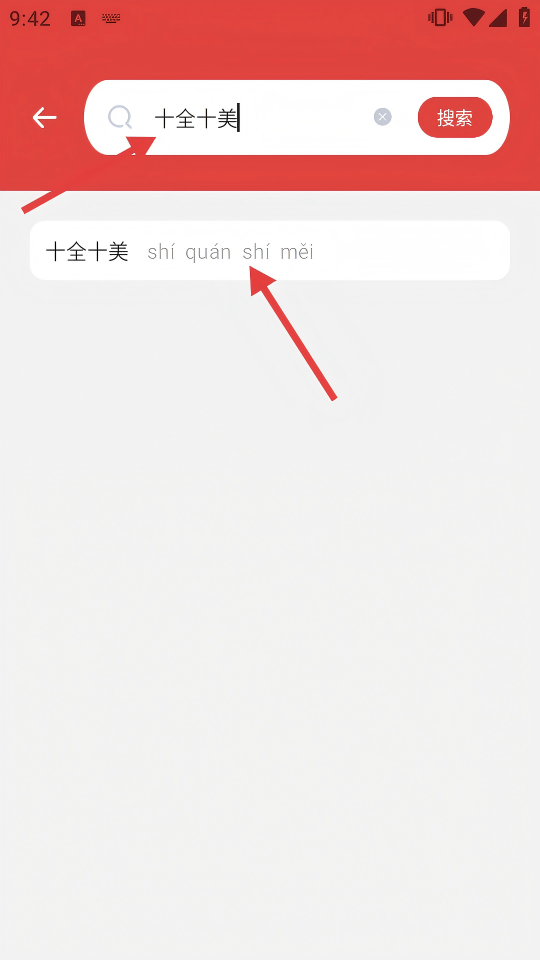 3、在搜索框输入【十全十美】并搜索,可看到该成语的拼音。