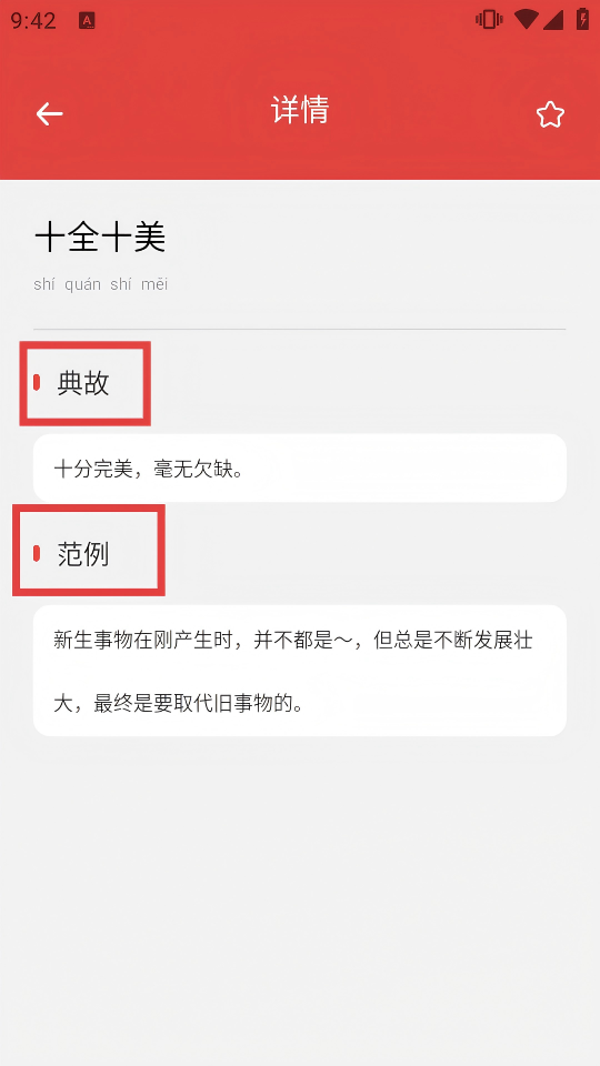 4、进入“十全十美”详情页,能查看其典故与范例。