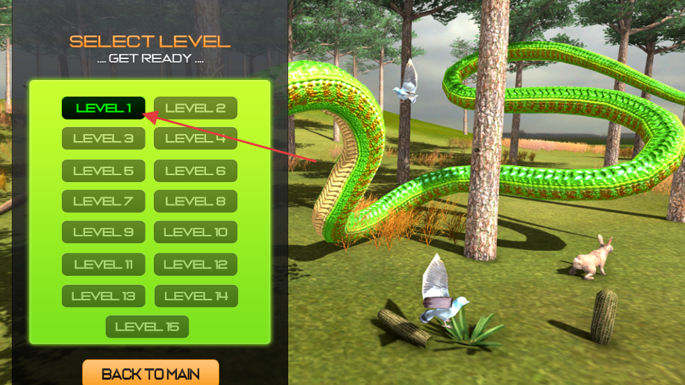 1、在关卡选择界面,点击“LEVEL1”按钮,进入第一关游戏场景,准备操控蛇进行游戏。