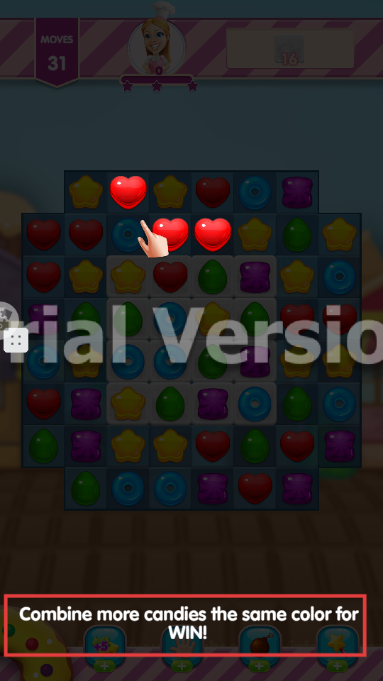1、按教程合并同色糖果,遵循【Combine-more-candies-the-same-color-for-WIN!】,优先消除同色(如红色)达成目标。