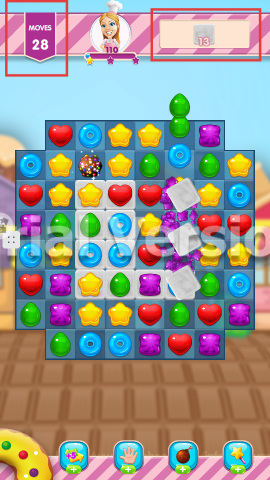 2、关注【MOVES-28】与【13】目标,利用彩色糖果特效消除,推进关卡目标完成。