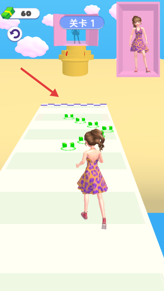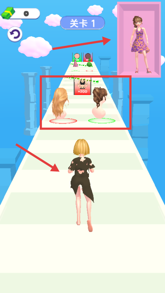 2、在跑道上收集发型、服装等元素,选择与目标造型匹配的装扮。
