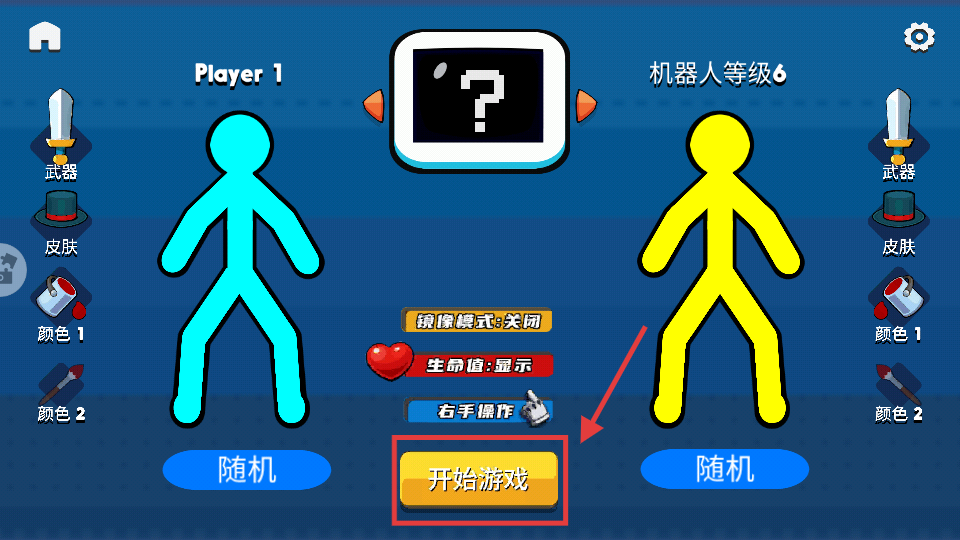 1、进入游戏前可设置武器、皮肤、颜色,点击【开始游戏】开启与【机器人等级6】的对战。