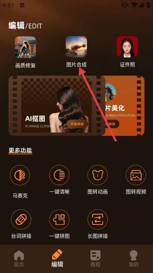 1、打开图片编辑类APP的“编辑”页面,点击【图片合成】,进入海报设计界面。