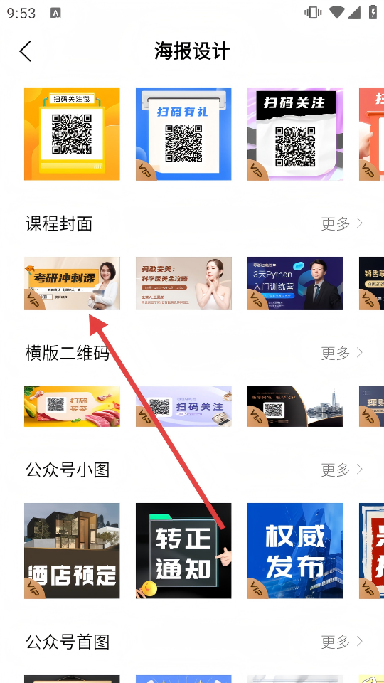 2、在海报设计界面,选择“课程封面”分类下的“考研冲刺课”封面模板。