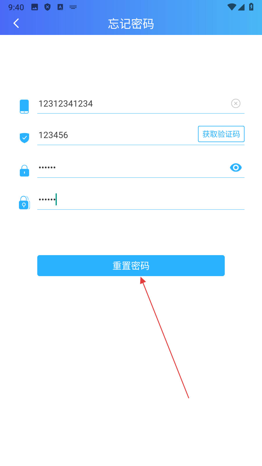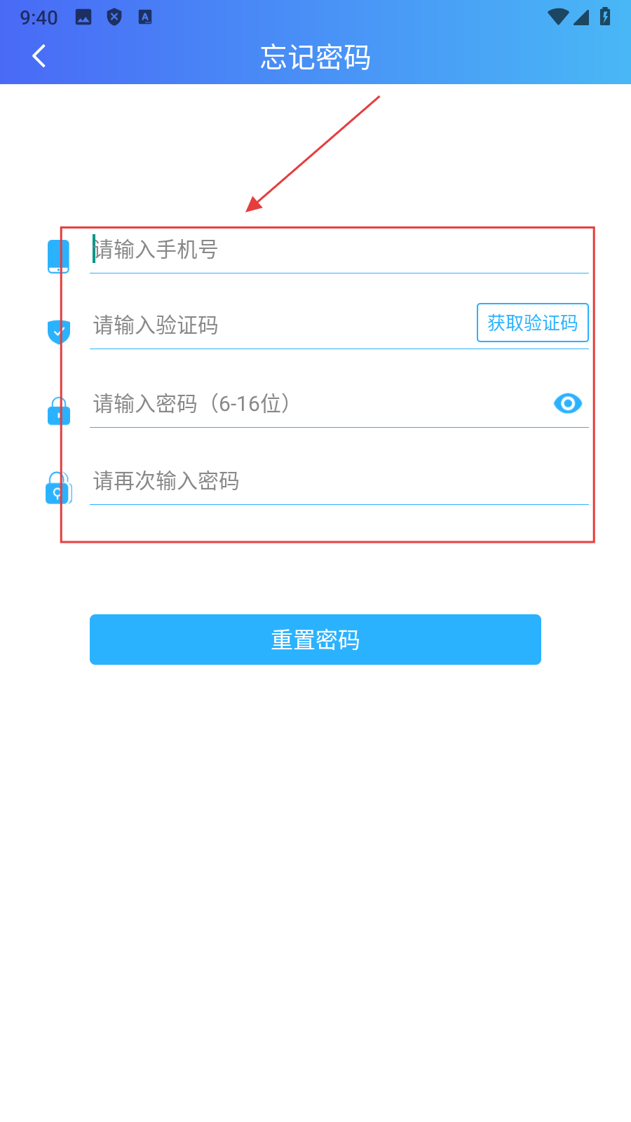 3、在忘记密码页面,依次【输入手机号、验证码以及新设置的密码】。