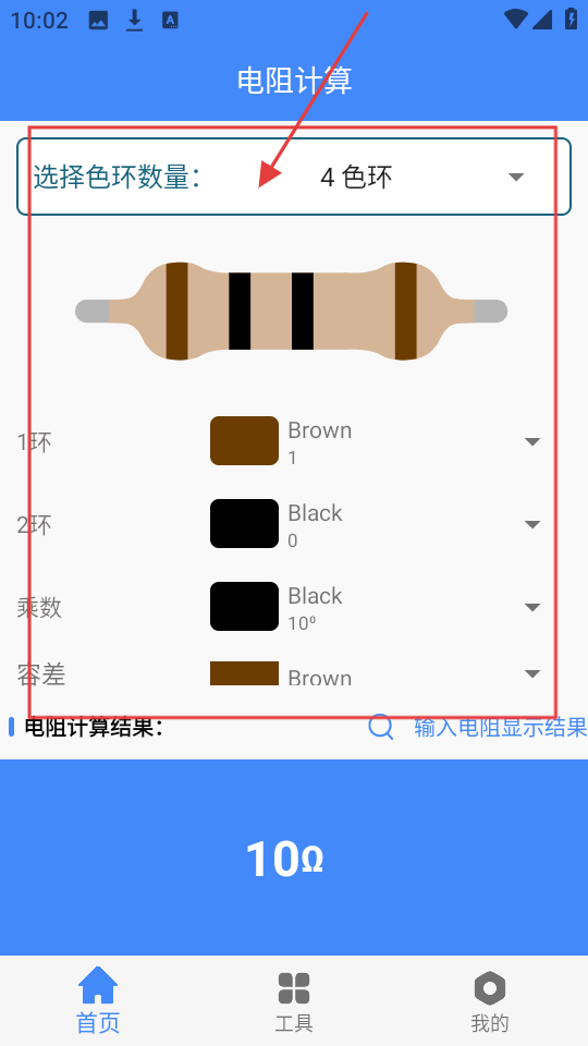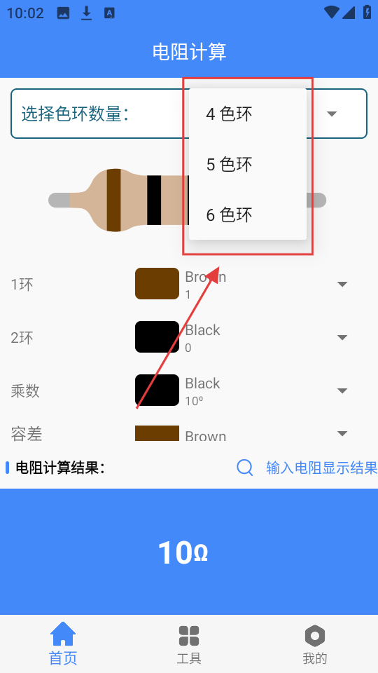 1、在“电阻计算”页面,若想选择色环数量,点击色环数量选择框,就能展开选项列表啦。