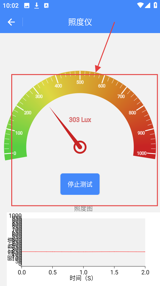 4、进入照度计页面后,可进行照度测试,测试结果会显示在仪表上,方便查看当前照度情况哟。