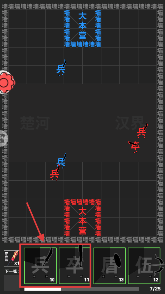 2、查看底部卡牌数量(【兵】10、【卒】11),选择合适卡牌出战,对抗敌方兵卒。