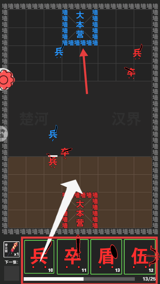 3、派遣出战卡牌(【兵】【卒】等),向敌方【大本营】推进,冲击敌方阵地。