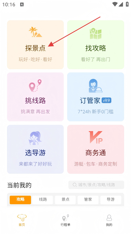 1、打开软件后,点击【探景点】模块,可进入景点探索页面。