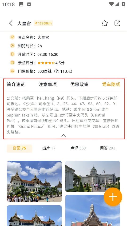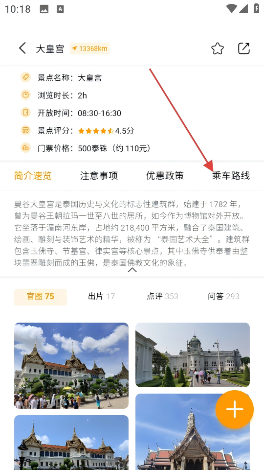 3、进入【大皇宫】详情页后,点击【乘车路线】选项,准备查看前往交通方式。