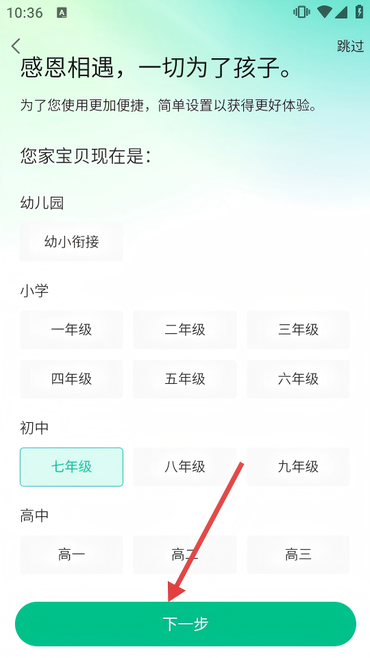 1、进入APP后,选择孩子所在学段(如初中七年级),点击【下一步】。