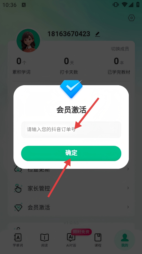 4、在会员激活弹窗中,输入抖音订单号,点击【确定】,完成会员激活操作。