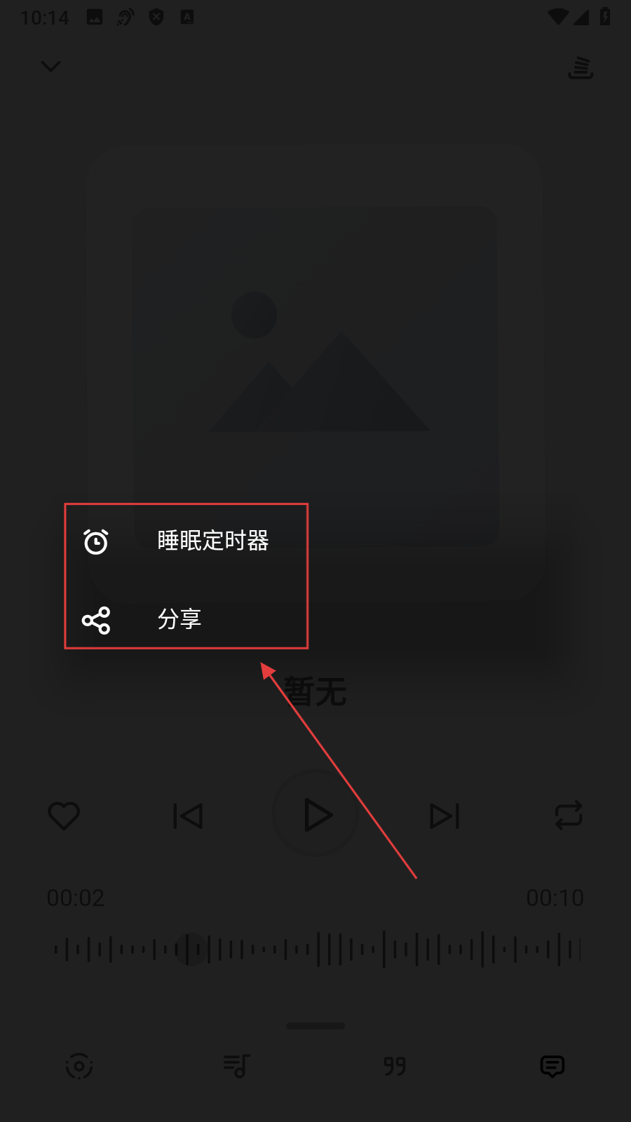 3、在功能选项,可设置【睡眠定时器】,让音乐伴随入眠,也能选择【分享】,把音乐分享给好友。