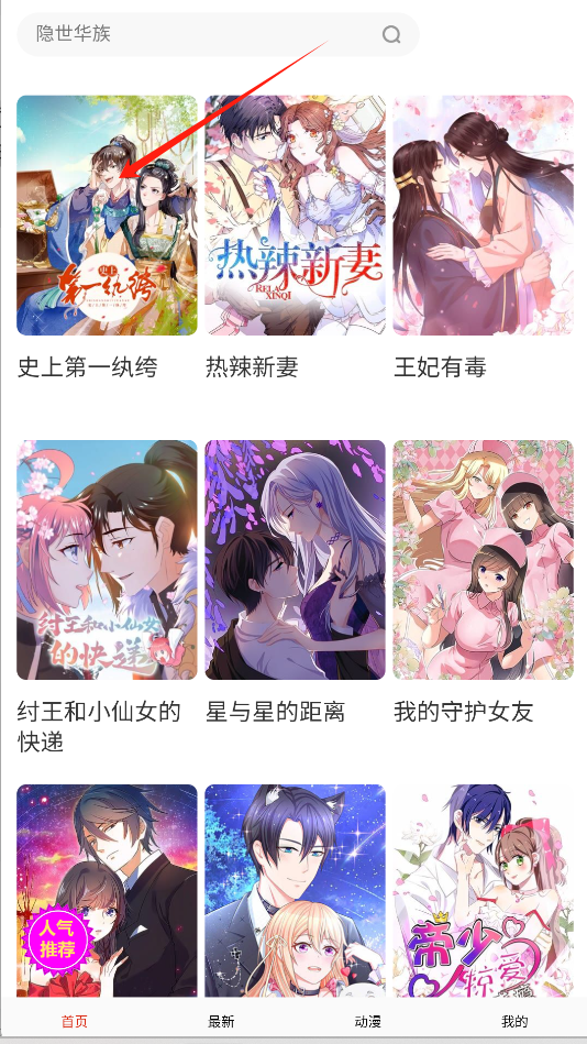 2、进入首页后,可在“人气推荐”等区域,点击《史上第一纨绔》等或喜欢的作品封面进入。
