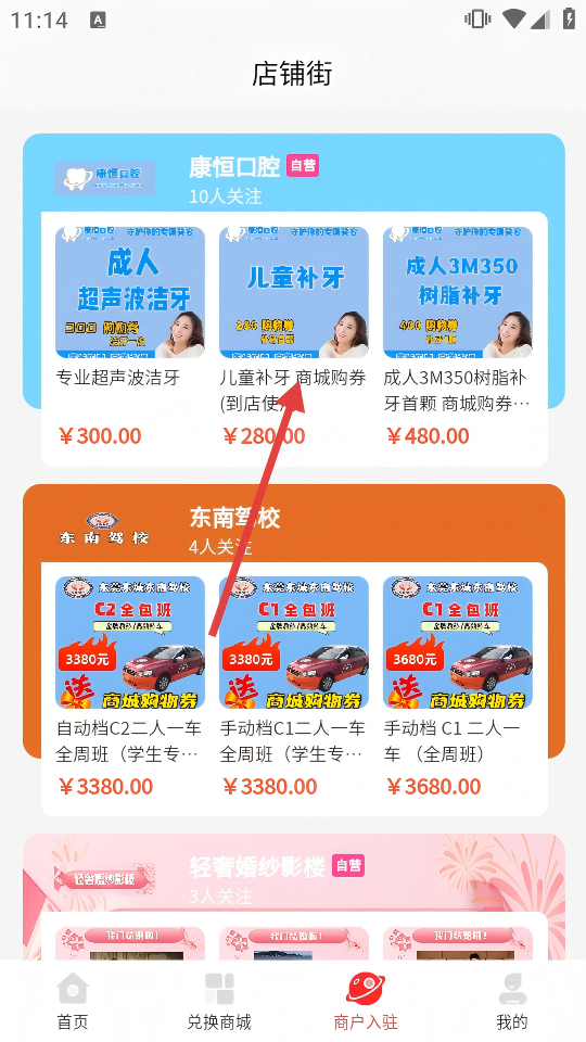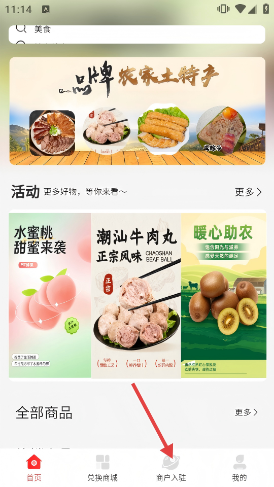 1、打开本地生活服务类APP首页,点击底部【商户入驻】,进入店铺街页面。