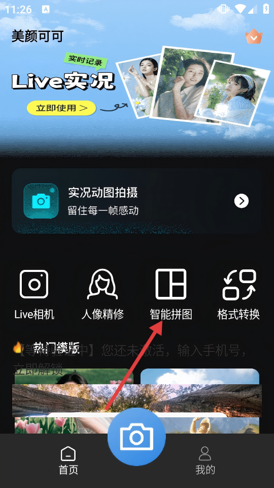 1、打开“美颜可可”APP首页,点击【智能拼图】,进入相机胶卷选择图片。