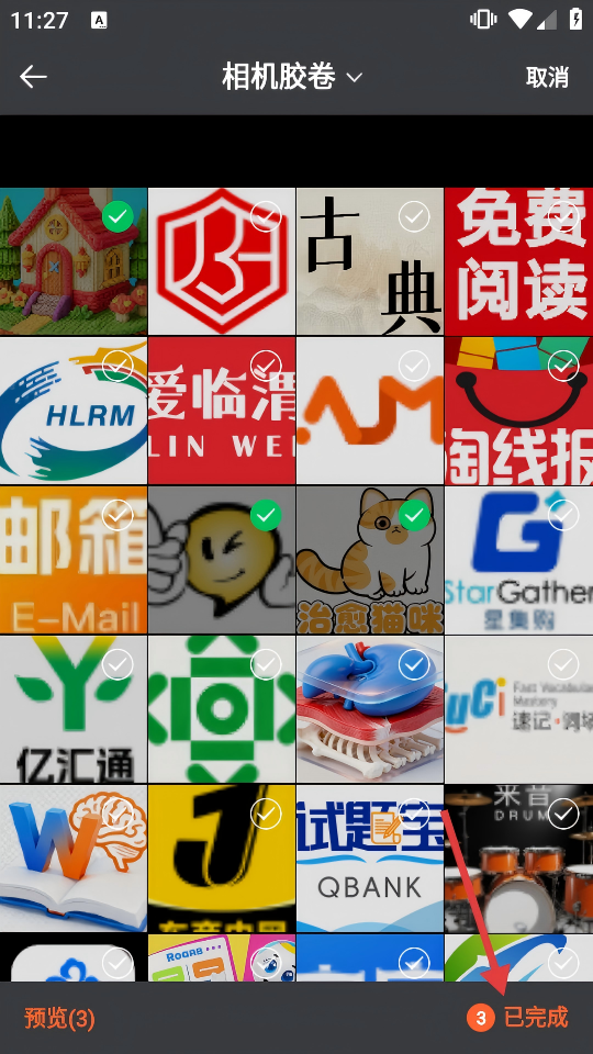 2、在相机胶卷中选择要拼图的图片,选好后点击【已完成】,进入拼图编辑页。
