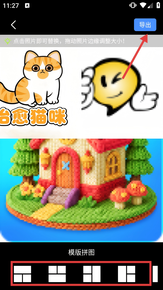 3、在拼图编辑页,可选择模板调整拼图样式,完成后点击【导出】。