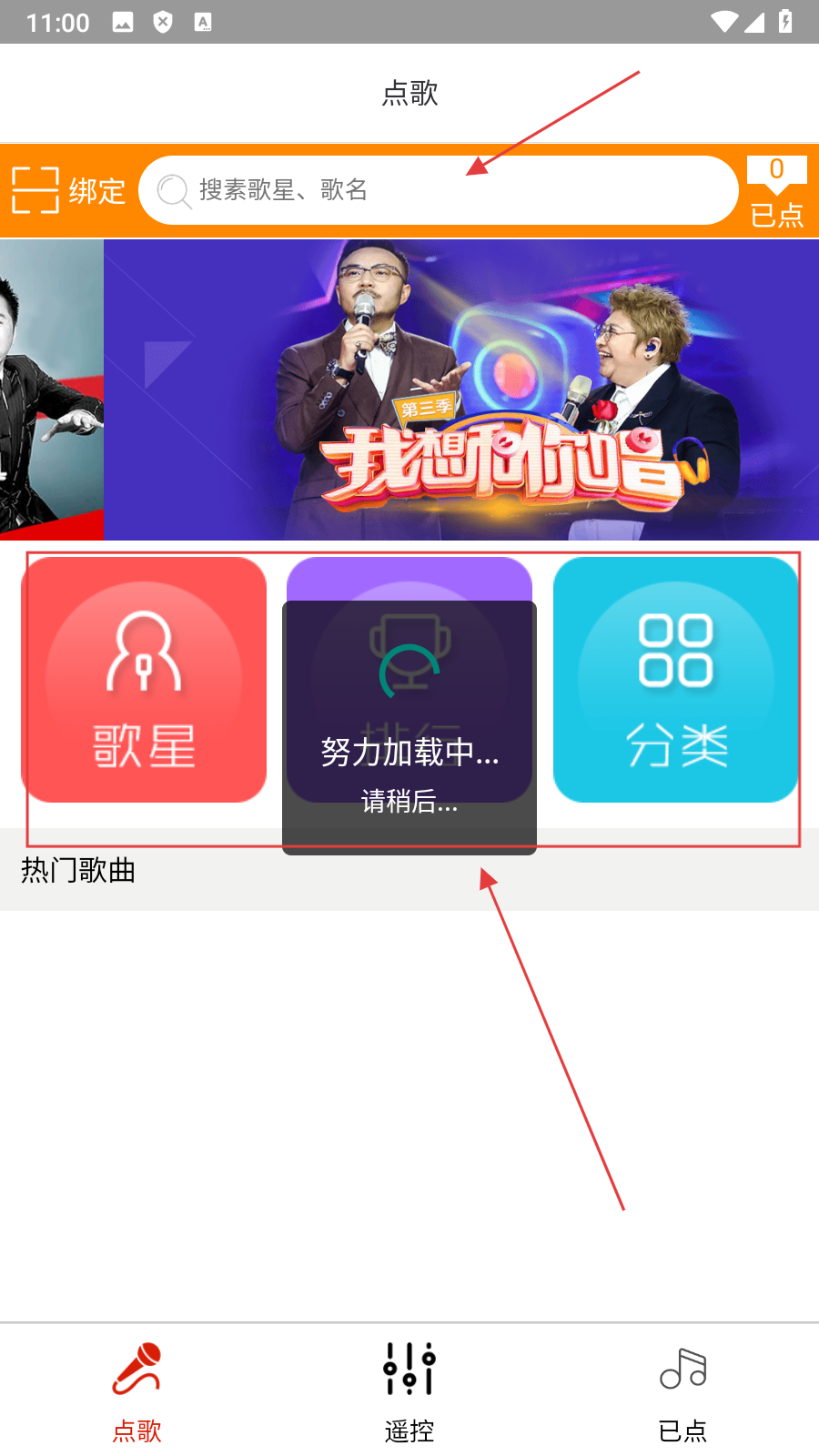 1、进入点歌界面,可【搜索歌星、歌名】,进入【歌星、排行、分类】后,还能查看热门歌曲,开启点歌体验。