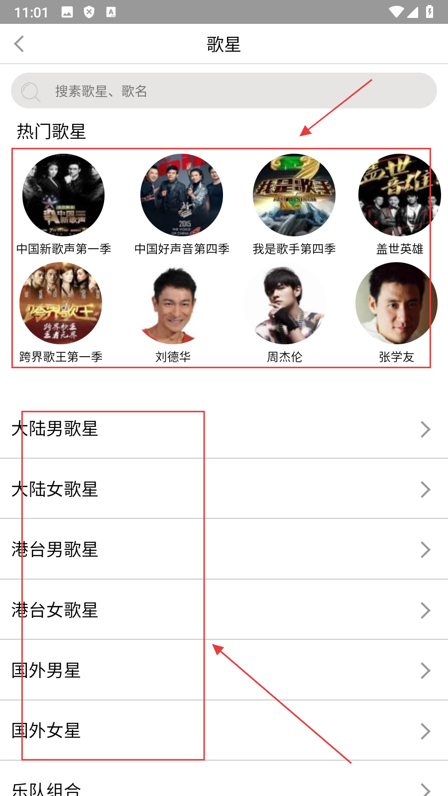 3、进入歌星界面,查看【热门歌星】,还有【大陆、港台、国外等各类歌星分类】,方便找到喜欢的歌手。
