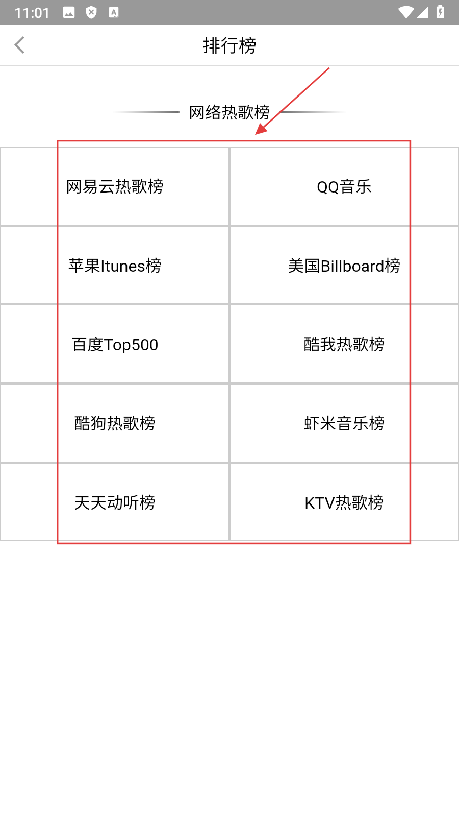 4、在排行榜界面,有【网易云热歌榜、QQ音乐】等众多榜单,能了解不同平台的热门歌曲。
