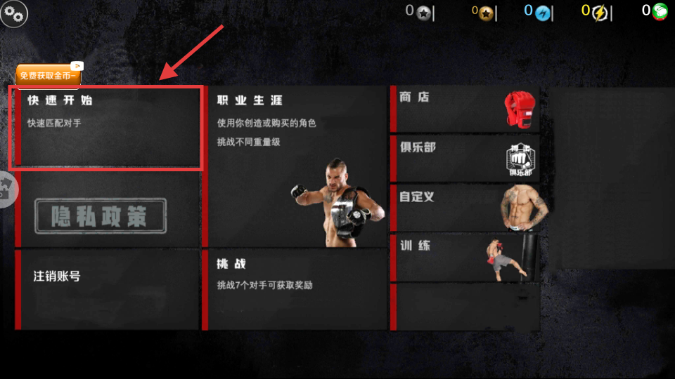1、选择【快速开始】-快速匹配对手,可快速进入格斗场景,适合新手熟悉操作与战斗节奏。