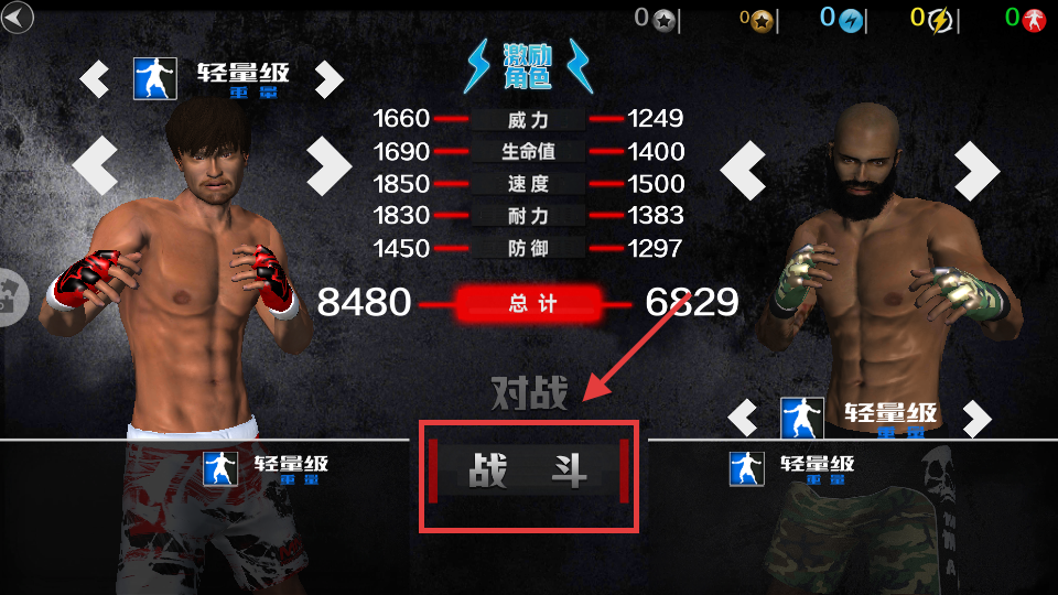 2、对比双方属性后点击【战斗】,正式登上拳台,开启与对手的拳击对决,检验格斗技巧。