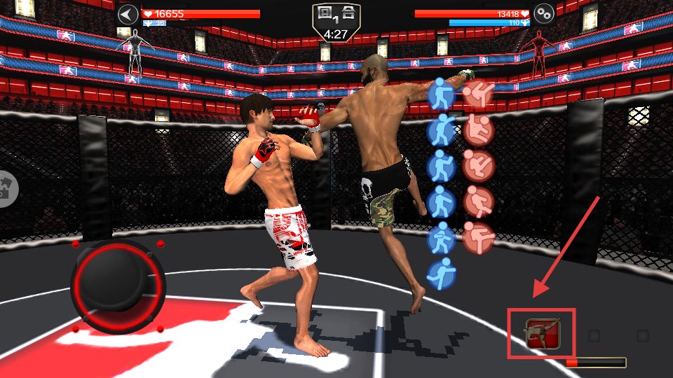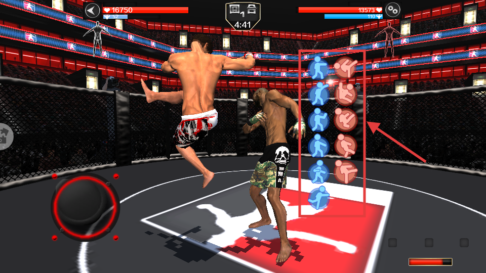 3、战斗中观察对手动作,点击右侧【蓝色-红色】技能图标,组合出招或防守,应对对手攻势。