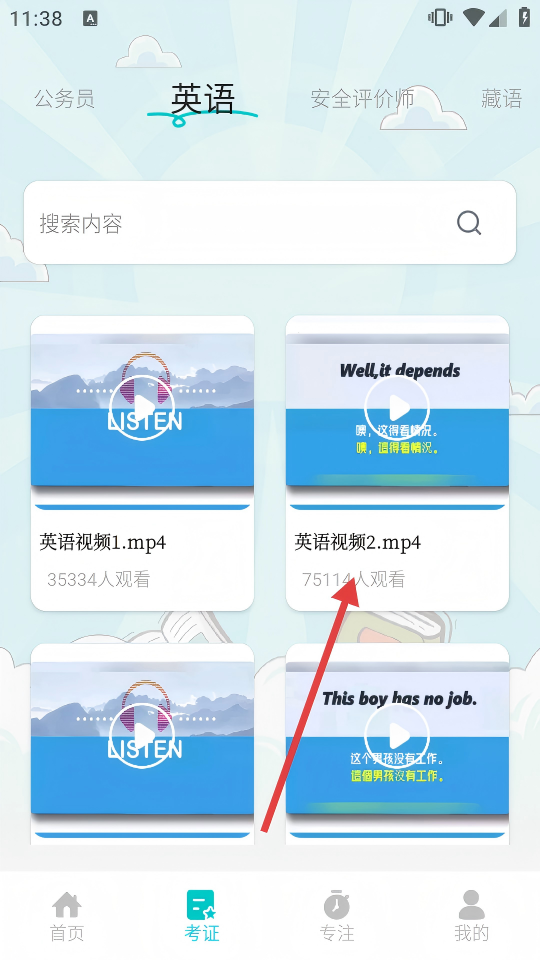 2、在考证页面“英语”分类下,选择【英语视频2.mp4】,进入视频详情页。