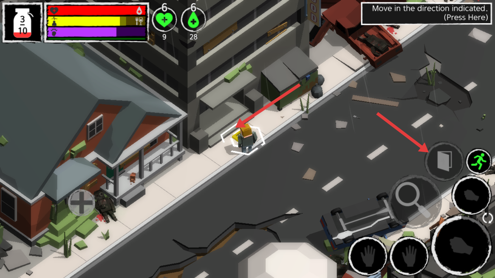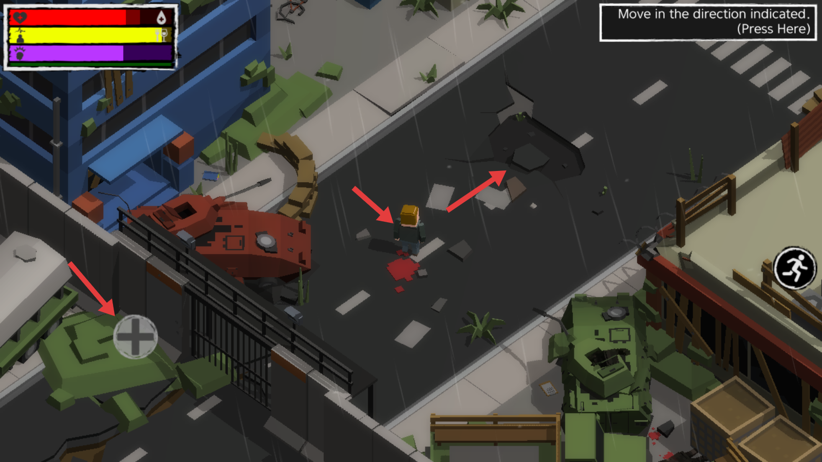 1、通过左侧虚拟摇杆,操控角色在城市废墟中移动。