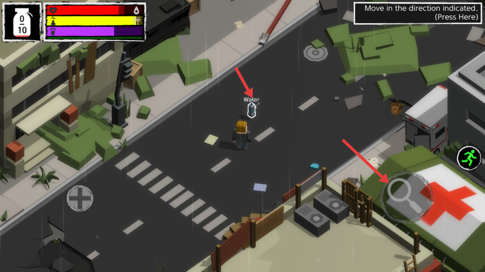 2、点击放大镜图标,寻找并收集“Water”等生存物资。