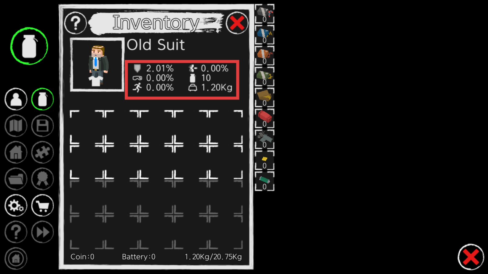 3、进入背包界面,查看装备“OldSuit”的属性和携带物资情况。