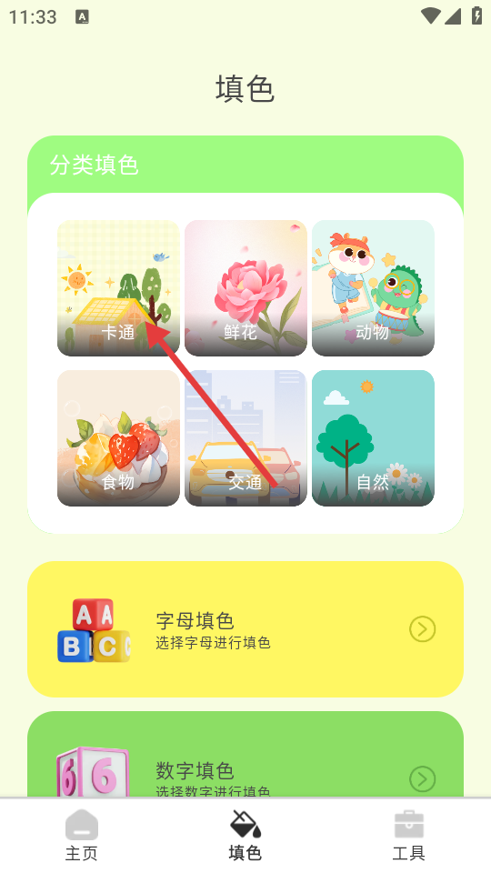 2、进入【填色】页面,可选择【卡通】分类填色。