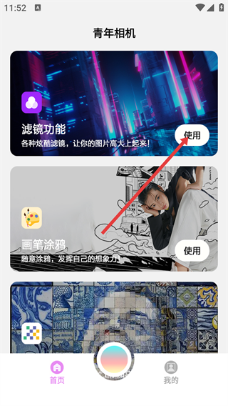 1、进入【青年相机】首页,若要给图片添加滤镜效果,可点击【滤镜功能】旁的“使用”按钮。