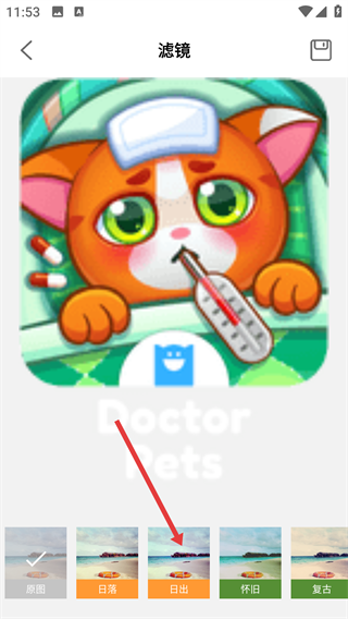 3、进入【滤镜】编辑页,从下方滤镜选项(如【日出】等)中选择喜欢的并点击,查看图片效果。