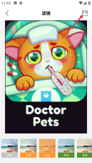 4、选好滤镜后,点击页面右上角的保存类图标,就能保存应用滤镜后的图片。