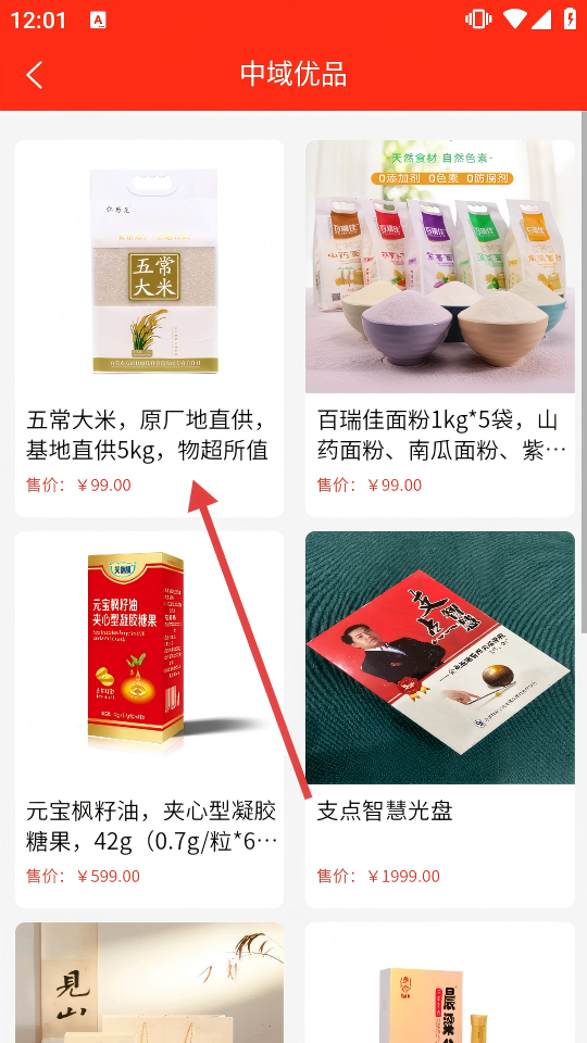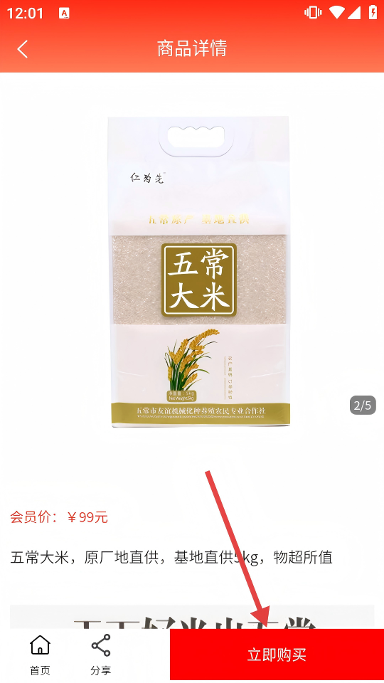 2、在商品列表页,选择【五常大米,原厂地直供,基地直供5kg】,进入商品详情页。