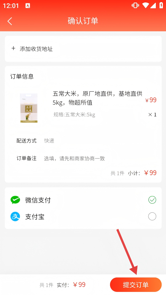 4、在确认订单页,添加收货地址,选择支付方式,点击【提交订单】完成购买。