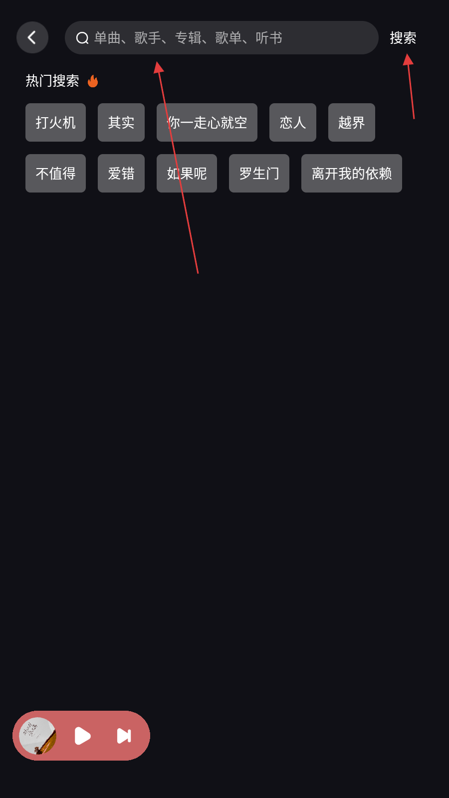 2、在搜索界面【输入内容】后,点击【搜索】,获取相关的歌曲等结果。