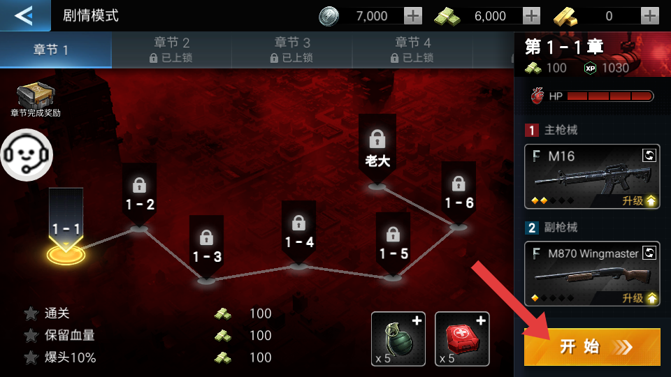 1、在【剧情模式】的【第-1-1章】界面,确认好枪械等装备情况后,点击【开始】按钮进入关卡。