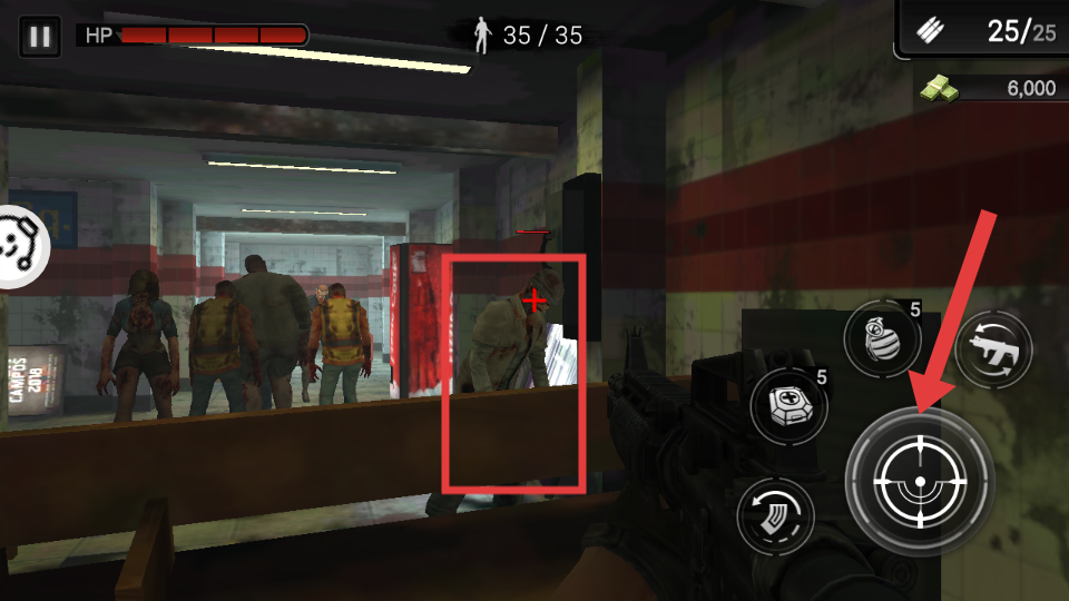 3、瞄准好僵尸后,点击右下角的射击按钮,瞄准如红框内的僵尸进行射击消灭它们。