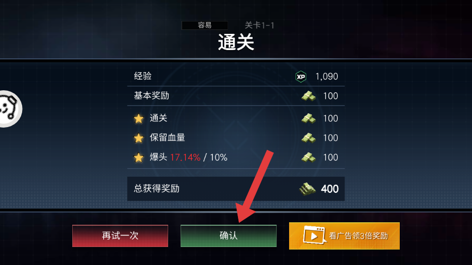 4、成功通关后,查看奖励情况,点击【确认】按钮,可选择继续挑战后续关卡或进行其他操作。