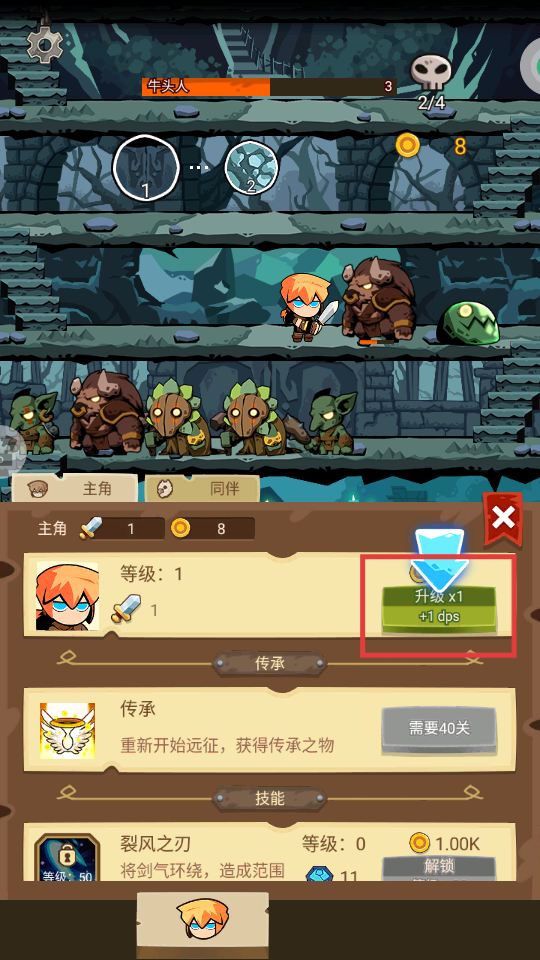 2、利用【升级x1】【+1-dps】功能,消耗资源升级主角,增强秒伤,应对更强敌人。