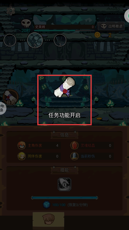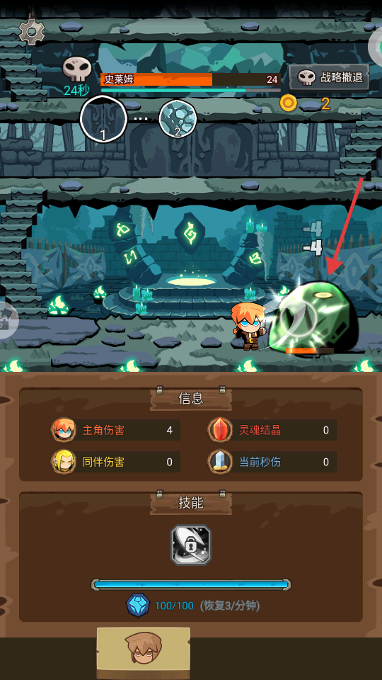 3、挑战【史莱姆】时,关注伤害数据,危险时点击【战略撤退】,保存自身,积累战斗经验。